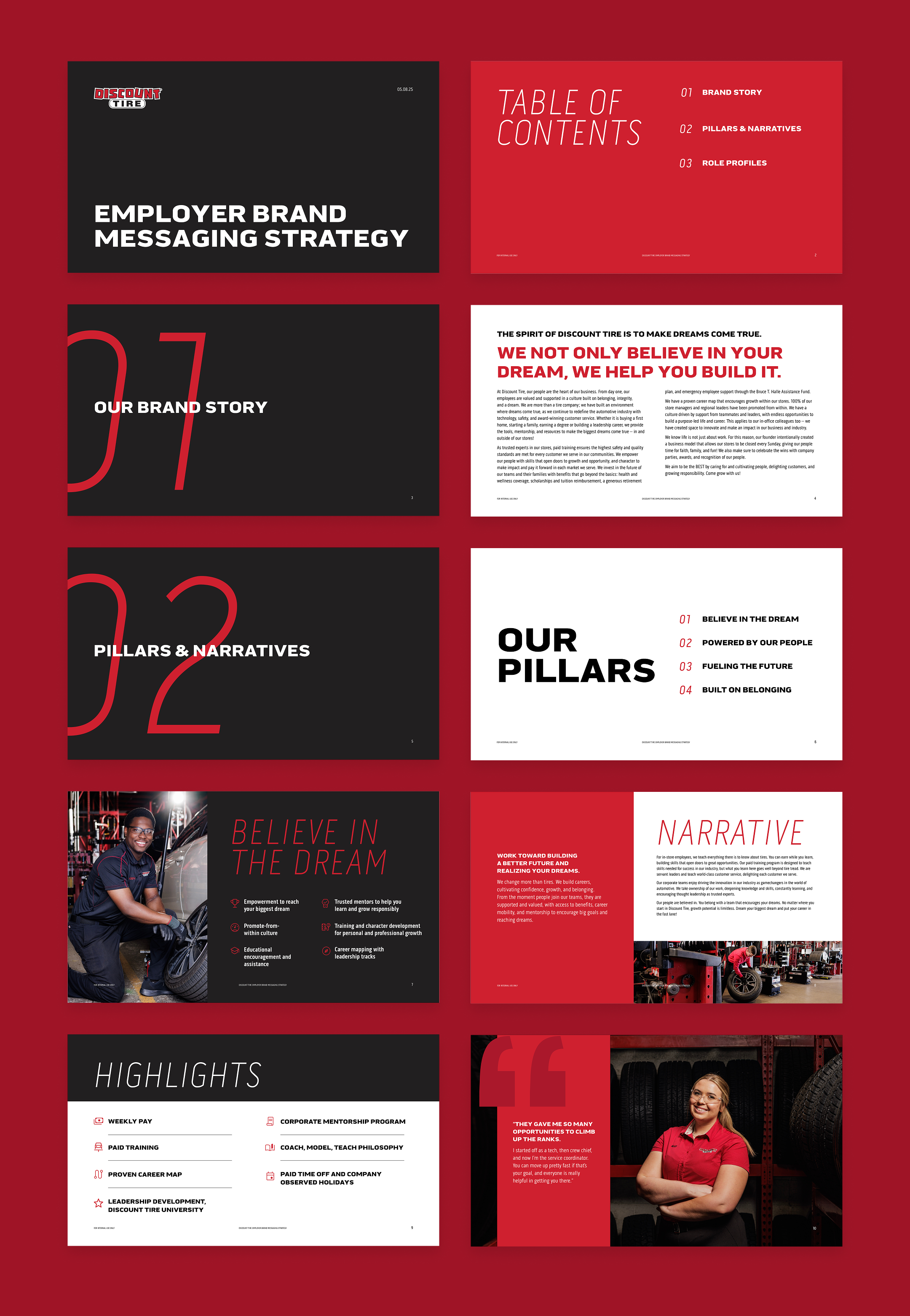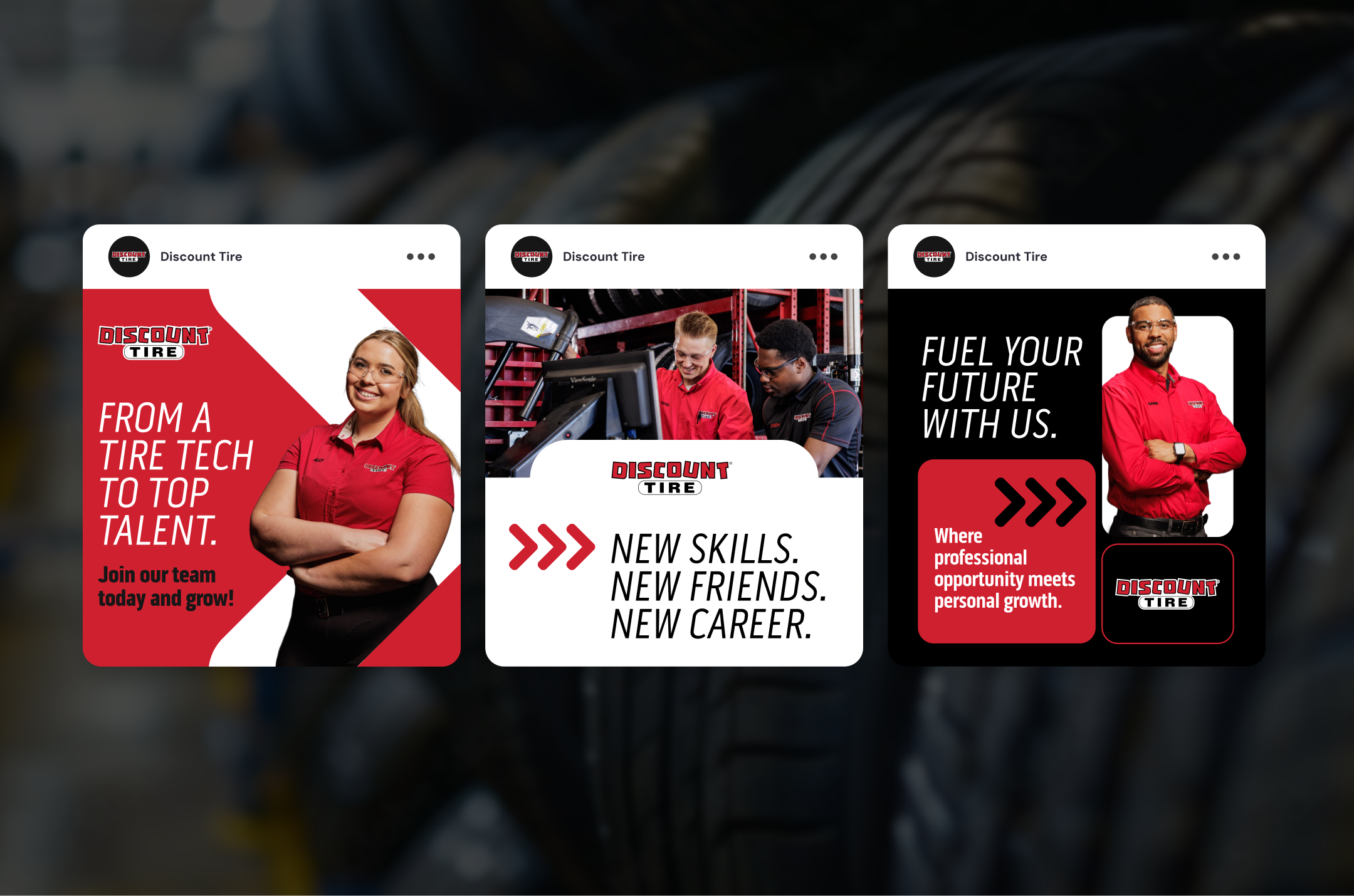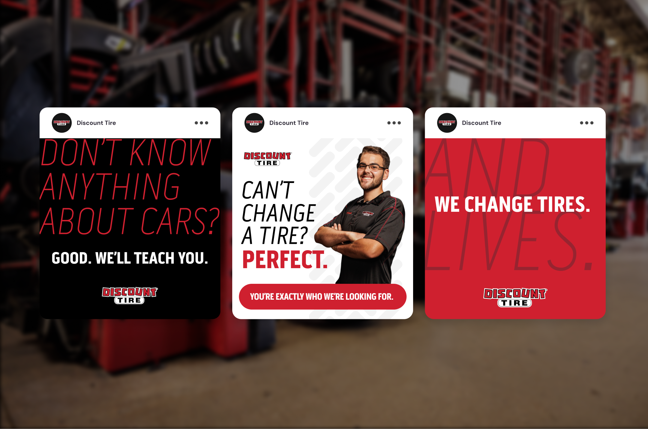 During the concepting phase, we translated discovery insights into distinct creative territories that reflected Discount Tire’s culture and hiring goals. By exploring multiple visual and messaging directions, we tested how the employer brand could show up in fresh, compelling ways by pushing beyond industry norms while staying grounded in authenticity. This process enabled us to strike a balance between strategic intention and creative exploration, ultimately delivering two flexible concepts that the team could utilize now and adapt for future campaigns.
